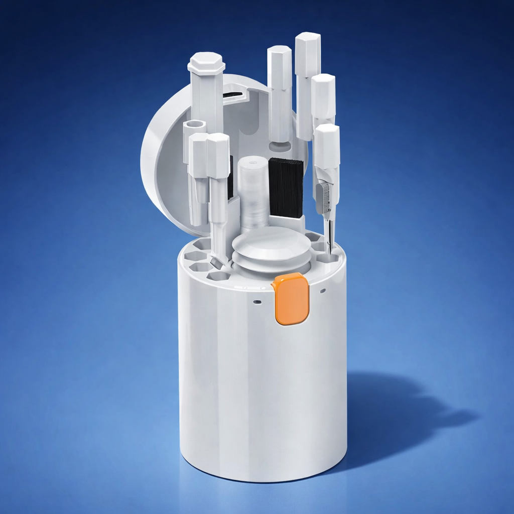 Kompaktowy zestaw do czyszczenia elektroniki i trudno dostępnych miejsc - porty USB, klawiatury, słuchawki i więcej.